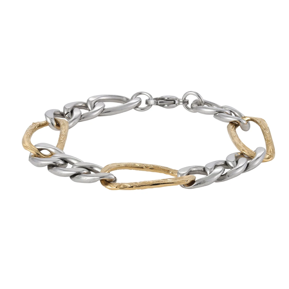 Náramek z chirurgické oceli vzor figaro, který nikdy nevyjde z módy. Povrch náramku je hladký leštěný, oválná očka mají gravírovaný povrch pozlacený technologií PVD. Zapínání náramku je karabinové. Náramek je dlouhý 21cm, šířka 12mm. Na přání lze délku náramku zdarma zkrátit.