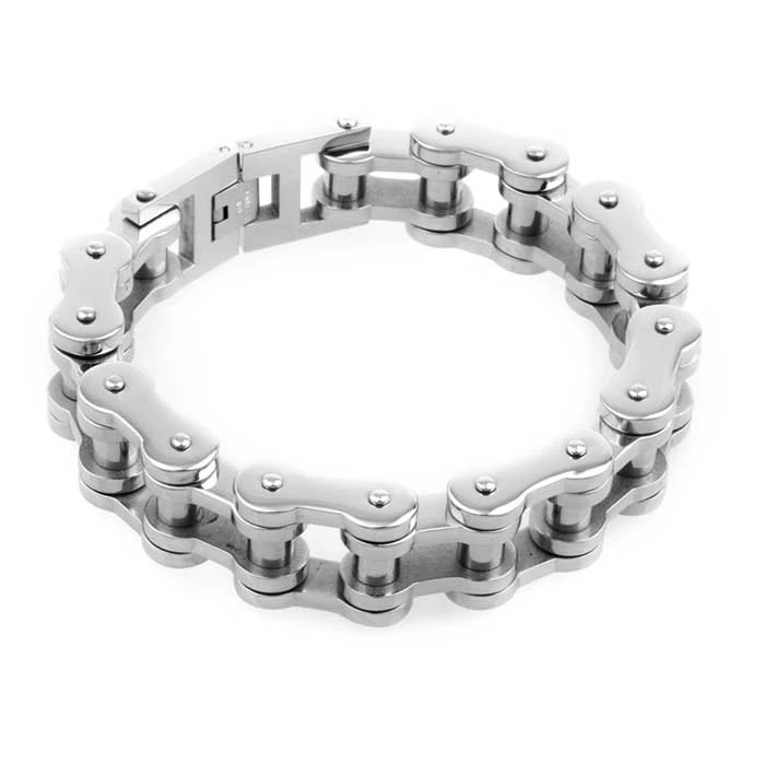 Náramek pro motorkáře vyrobený z chirurgické oceli napodobující motocyklový řetez. Povrch náramku je leštěný. Pánský náramek řetěz na ruku široký 22mm, tloušťka náramku 12mm, délka náramku 23,5cm.