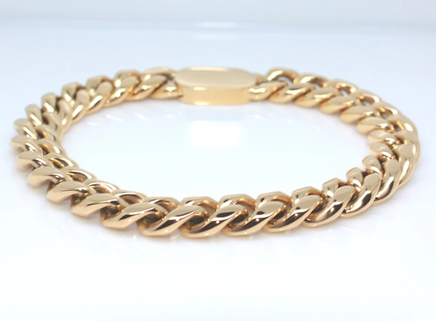 Náramek z chirurgické oceli. Náramek má povrch upravený technologií PVD na zlatou. Šířka náramku 10mm. Do karabinky lze vyrýt např. monogram.