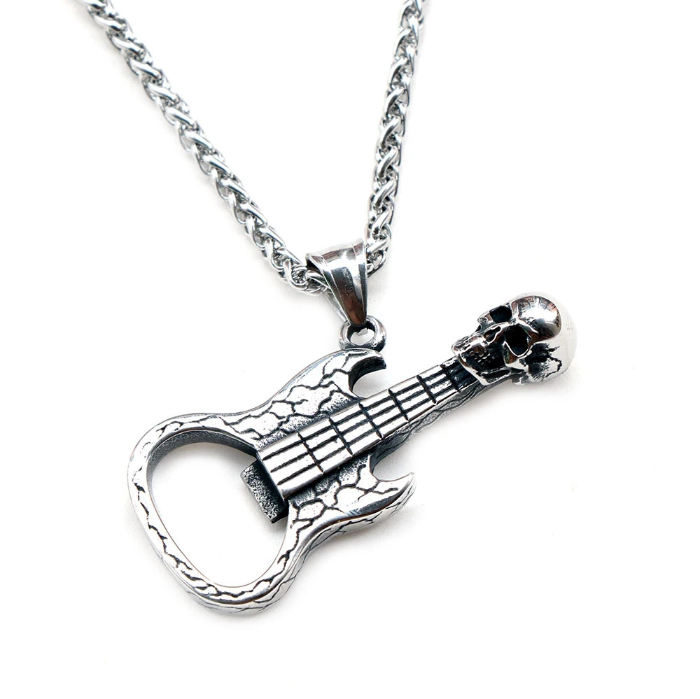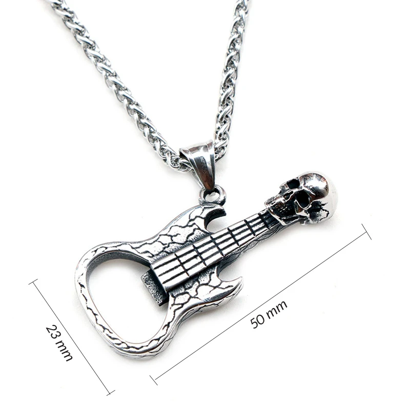 Ocelový přívěsek kytara, kterou lze použít jako otvírák lahví. Rozměr kytary najdete zobrazený na podpůrné fotografii. K přívěsku náleží ocelový řetízek vzor ankr dlouhý 60 cm.