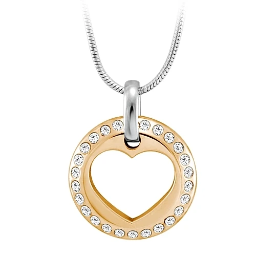 Přívěsek z chirurgické oceli 316l. Přívěsek má leštěný povrch v barvě růžového zlata. Přívěsek je ozdobený zirkony. Průměr přívěsku 18mm. Očko na přívěsku je vhodné pro ocelový řetízek do průměru 3mm.