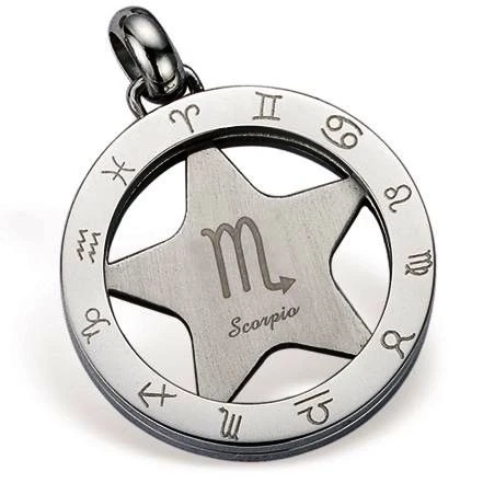 Přívěsek se znamením štíra (24.10 - 22.11). Přívěsek je vyrobený z chirurgické oceli. Znamení štíra je "lemováno" symboly ostatních znamení zvěrokruhu. Součástí znamení je řetízek z chirurgické oceli vzor pancr se zapínáním na karabinu, dlouhý 60cm. Přívěsek má průměr 25mm. Na přání je možné řetízek zdarma zkrátit.