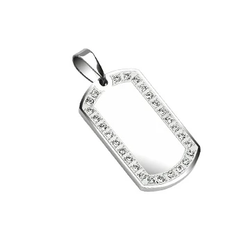 Přívěsek z chirurgické oceli 316L. Přívěsek má leštěný povrch do kterého je možno rýt. Přívěsek je ozdobený kamínky. Rozměry přívěsku 35*20mm.