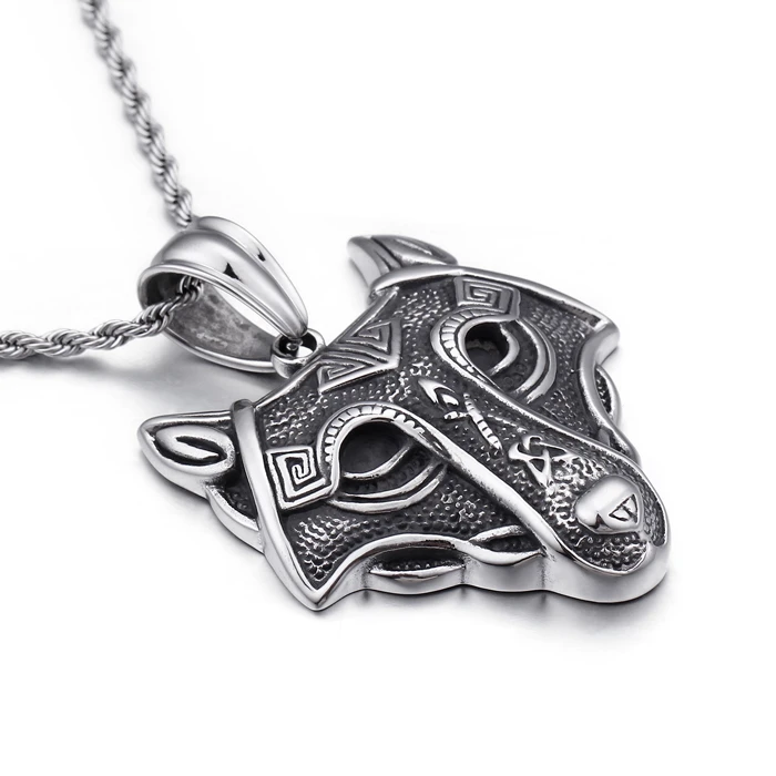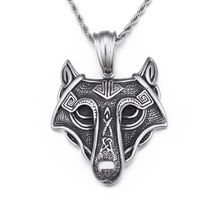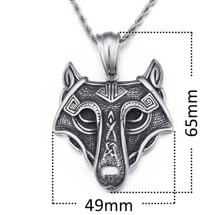 Náhrdelník z chirurgické oceli s vlčí hlavou. Vlčí hlava symbolizuje síly a mužnost. V severské mytologii doprovázeli boha Ódina vždy dva vlci. Jako všechny ocelové šperky je také tento náhrdelník z chirurgické oceli odolný proti poškození, neoxiduje, nemění barvu a nevyvolává alergické reakce.