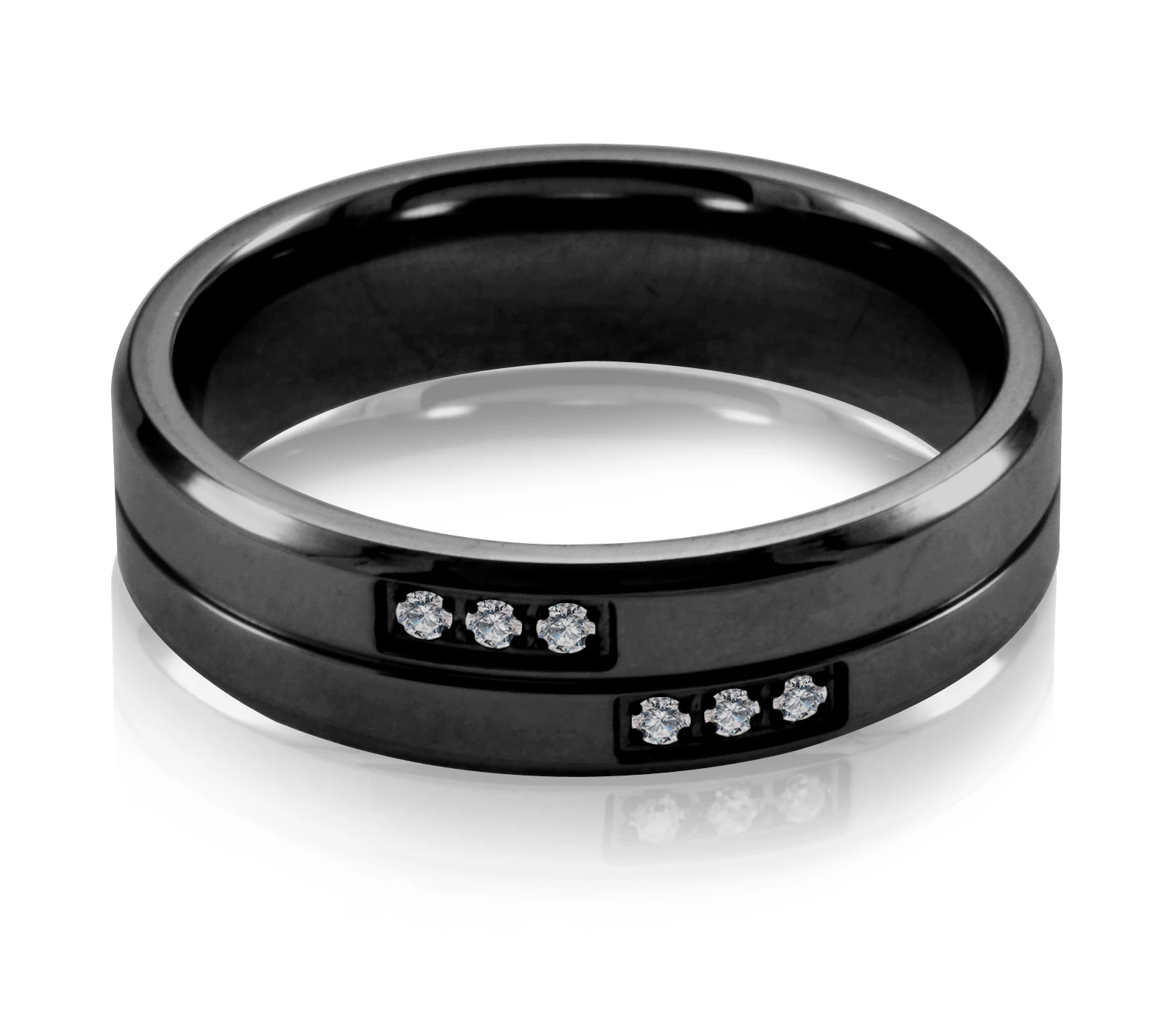 Prsten z chirurgické oceli 316L. Prsten má černý leštěný povrch zdobený zirkony. Zirkony tvoří s černou barvou krásný kontrast. Prsten je široký 6mm. Hezký dámský ocelový prsten.
