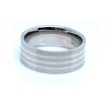 Prsten z chirurgické oceli 316L. Prsten má matný povrch. Prsten má po obvodě tři proužky. Prsten je široký 8mm. Prsten lze použít jako snubní.