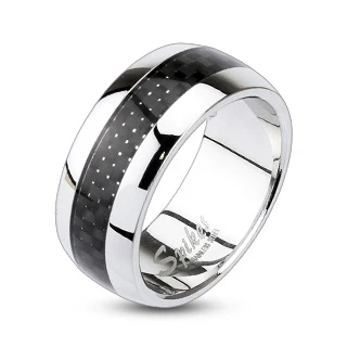 Prsten z chirurgické oceli 316L. Povrch prstenu je leštěný. Prsten je dokola ozdobený karbonovým proužkem. Ve velikostech 49–57 je prsten široký 7mm, ve velikostech 59–69 je prsten široký 9mm. Tento prsten je možné použít jako netradiční snubní prsten.