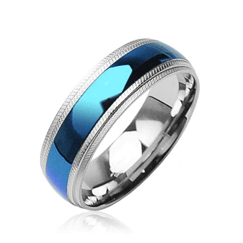 Prsten z chirurgické oceli 316L. Povrch prstenu má modrou barvu nanášenou technologií IP, která zabraňuje předčasnénu setření. Kraje prstenu jsou ozdobené drážkami ve dvou řadách. Prsten je široký 8mm.