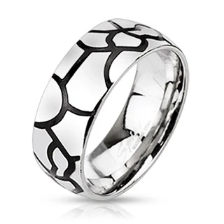Prsten z chirurgické oceli 316L. Povrch prstenu je leštěný s černou barvou, která vyplňuje „nepravidelné praskliny“ na povrchu prstenu. Prsten je široký 8mm. Zajímavý prsten z chirurgické oceli pro muže i ženu.
