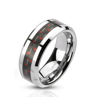 Prsten z chirurgické oceli 316L. Prsten má leštěný povrch doplněný karbonovým vláknem. Prsten je ve velikostech 49–57 široký 6mm, ve velikostech 59–72 je prsten široký 8mm. Tento prsten lze použít jako snubní. Pěkný prsten z chirurgické oceli.