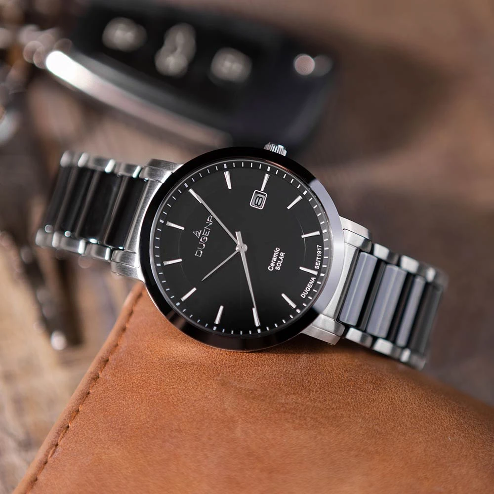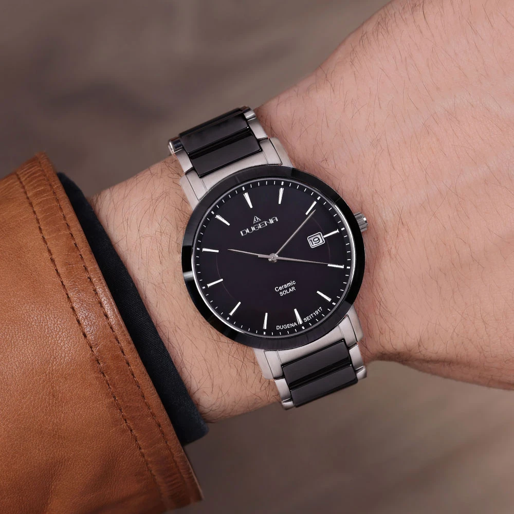 Pánské náramkové hodinky od Německého výrobce Dugena. Hodinky jsou kombinace ušlechtilé chirurgické oceli a keramiky. Hodinky disponují ukazatelem data, hodinovou, minutovou a vteřinovou ručičkou, černý ciferník s indexy. Pouzdro z chirurgické oceli má průměr 40 mm. Provoz hodinek zabezpečuje spolehlivý strojek na solární energii. Hodinky jsou dodávané v originální krabičce s logem Dugena. Voděodolnost hodinek 5 ATM.