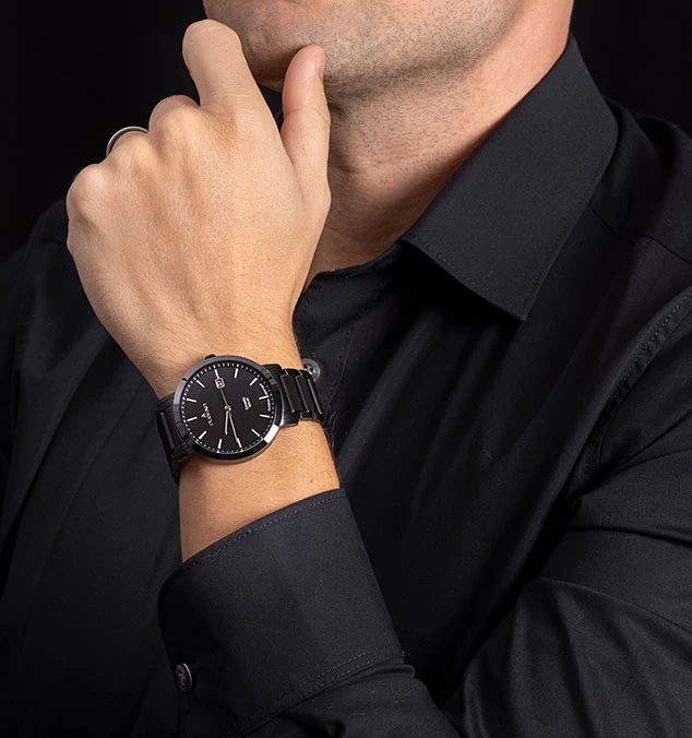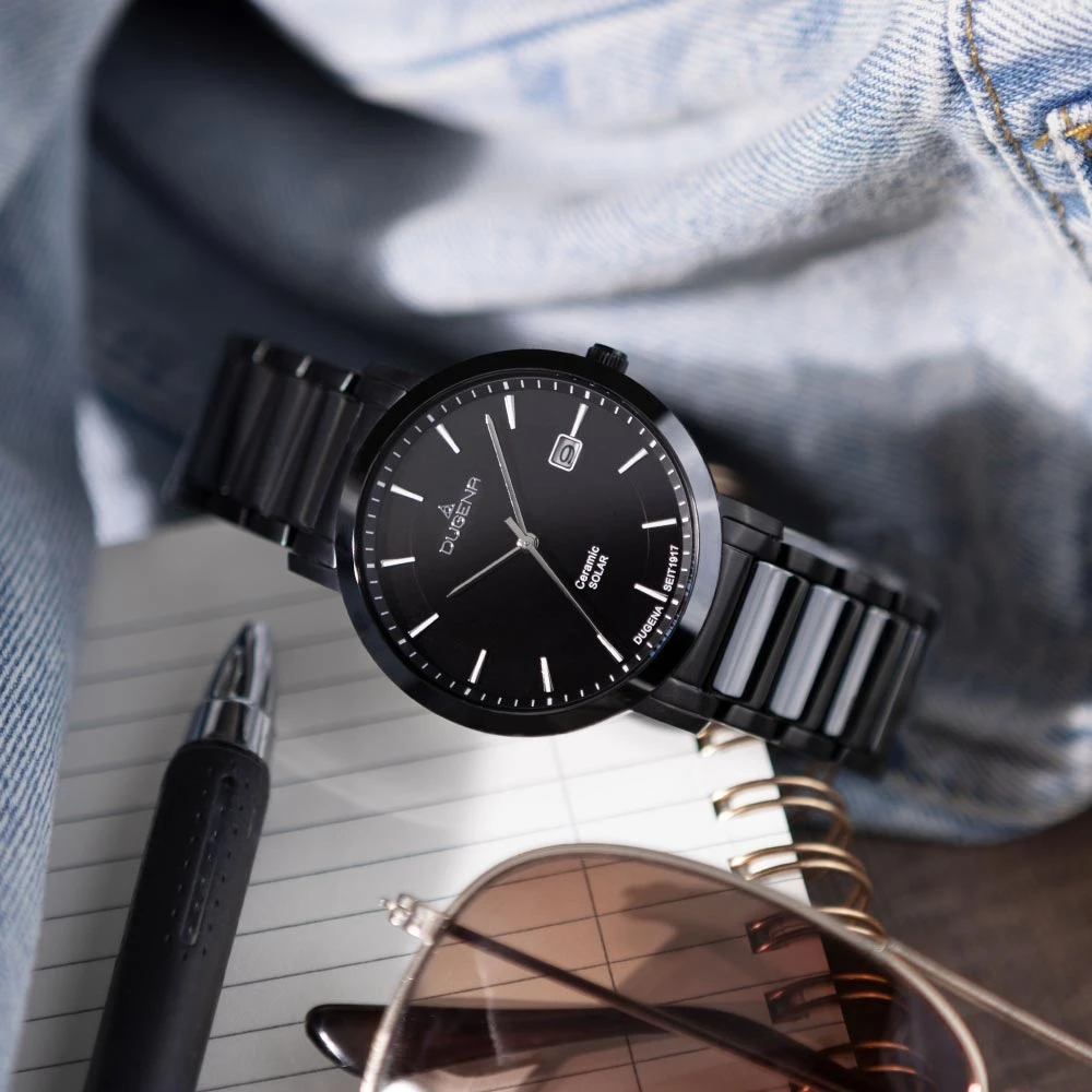 Pánské náramkové hodinky od Německého výrobce Dugena. Hodinky jsou kombinace ušlechtilé chirurgické oceli a keramiky. Hodinky disponují ukazatelem data, hodinovou, minutovou a vteřinovou ručičkou, černý ciferník s indexy. Pouzdro z chirurgické oceli má průměr 40 mm. Provoz hodinek zabezpečuje spolehlivý strojek na solární energii. Hodinky jsou dodávané v originální krabičce s logem Dugena. Voděodolnost hodinek 5 ATM.