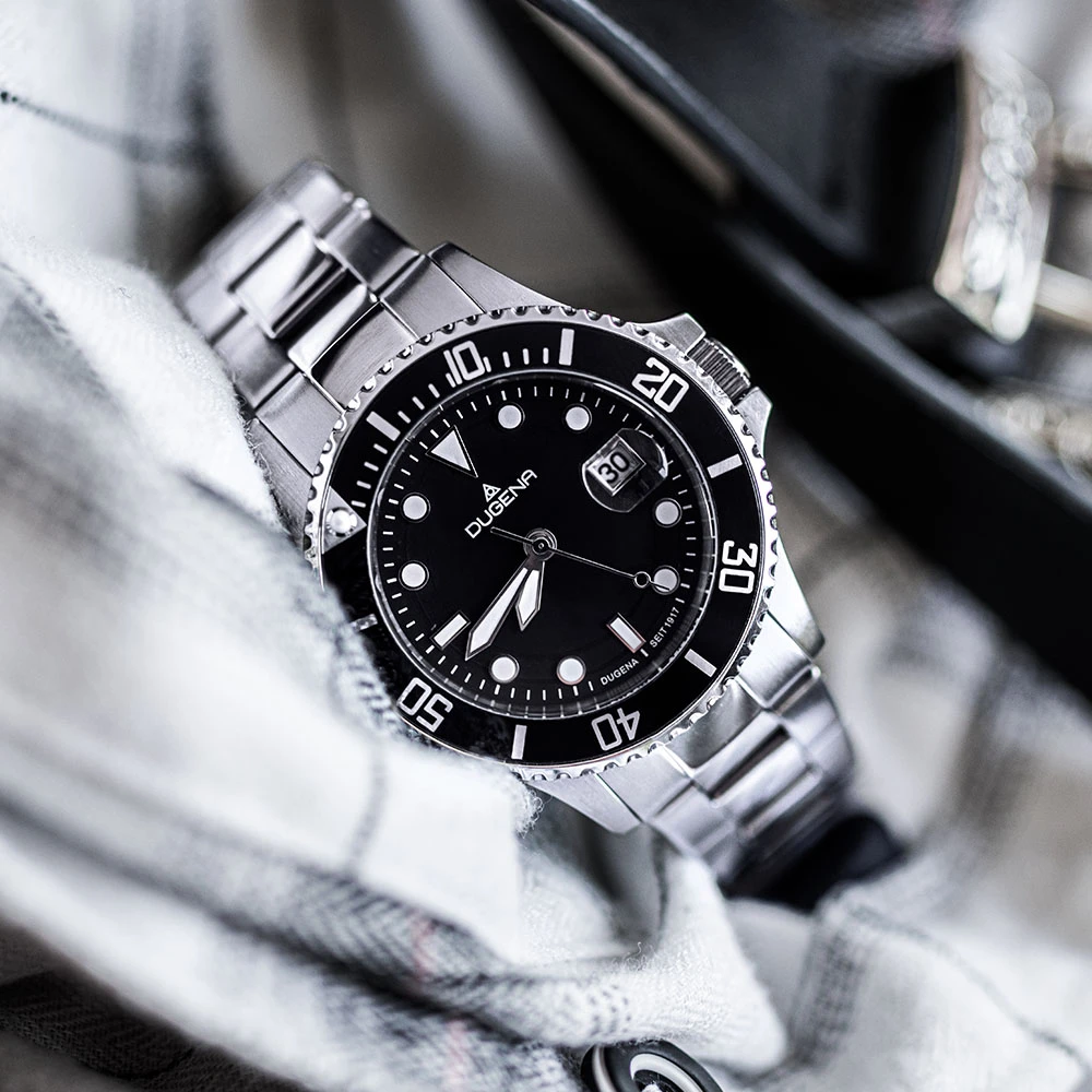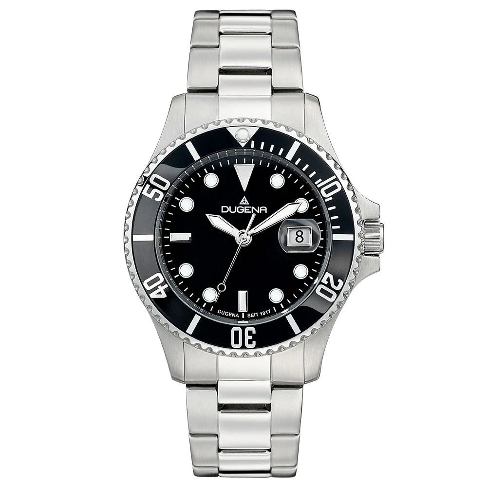 Pánské náramkové sportovní hodinky od Německého výrobce Dugena. Hodinky jsou voděodolné na úrovni 30 ATM a je možné je používat na vodní sporty. Hodinky disponují ukazatelem data, hodinovou, minutovou a vteřinovou ručičkou, černý ciferník s indexy. Datum je zvýrazněné pomocí lupy integrované do minerálního sklíčka. Hodinová a minutová ručka jsou potažené luminescenční vrstvou stejně jako indexy, a svítí ve tmě. Pouzdro z chirurgické oceli má průměr 40 mm, tloušťka pouzdra 13,5 mm. Náramek z chirurgické oceli má zapínání na složenou sponu s pojistkou. Provoz hodinek zabezpečuje spolehlivý bateriový strojek. Hodinky jsou dodávané v originální krabičce s logem Dugena.