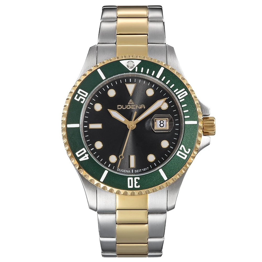 Pánské náramkové sportovní hodinky od Německého výrobce Dugena. Hodinky jsou voděodolné na úrovni 30 ATM a je možné je používat na vodní sporty. Hodinky disponují ukazatelem data, hodinovou, minutovou a vteřinovou ručičkou, černý ciferník se zlatě orámovanými indexy. Datum je zvýrazněné pomocí lupy integrované do minerálního sklíčka. Pouzdro z chirurgické oceli má průměr 44 mm, tloušťka pouzdra 12 mm. Provoz hodinek zabezpečuje spolehlivý bateriový strojek. Hodinky jsou dodávané v originální krabičce s logem Dugena.