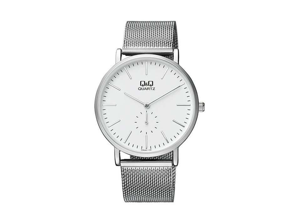 Pánské hodinky na ruku Q+Q. Hodinky mají hodinovou, minutovou a vteřinovou ručku. Hodinky pohání spolehlivý bateriový strojek Myiota. kovové pouzdro má průměr 40mm, průměr ciferníku 36mm. Kovový tah se zapínáním na přezku je široký 20mm. Hodinky jsou balené do pladtové krabičky s průhledným víčkem.