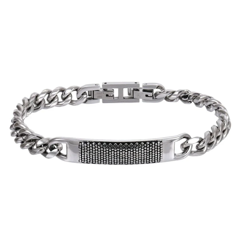 Náramek na ruku z chirurgické oceli s destičkou. Povrch náramku je leštěný, destička je ozdobená platisckým vzorem. Náramek je široký 10 mm, díky dvojitému zapínání lze nastavit délku náramku na úrovni 22 cm a 20,5 cm. Vzhledem k použitému materiálu je náramek odolný proti poškrábání a nevyvolává alergické reakce, bez obav ho mohou nosit osoby s citlivou pokožkou.