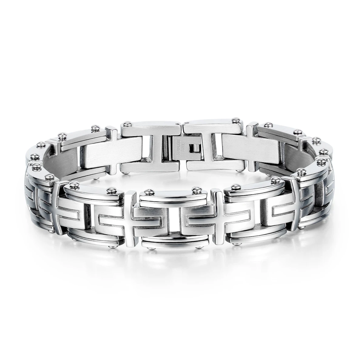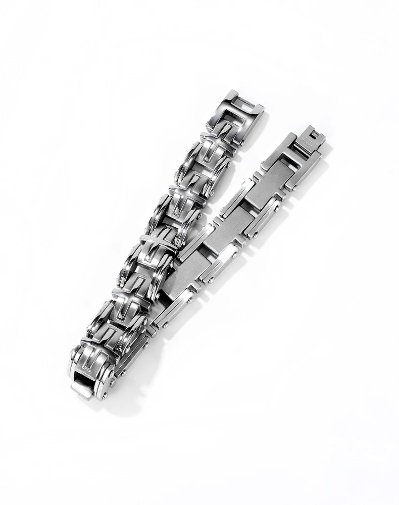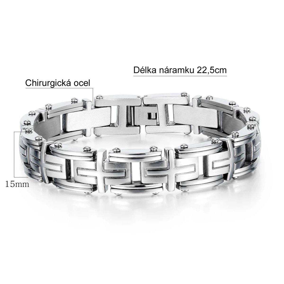 Náramek z chirurgické oceli pro muže. Povrch náramku kombinuje leštěnou a matnou úpravu. Náramek je dlouhý 22,5cm, šířka náramku 15mm.