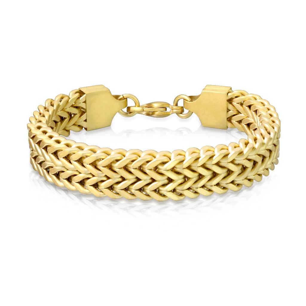 Náramek na ruku pro muže z pozlacené chirurgické oceli. Povrch náramku je matný pozlacený technologií PVD. Náramek je široký 12mm, zapínání náramku je karabinové.