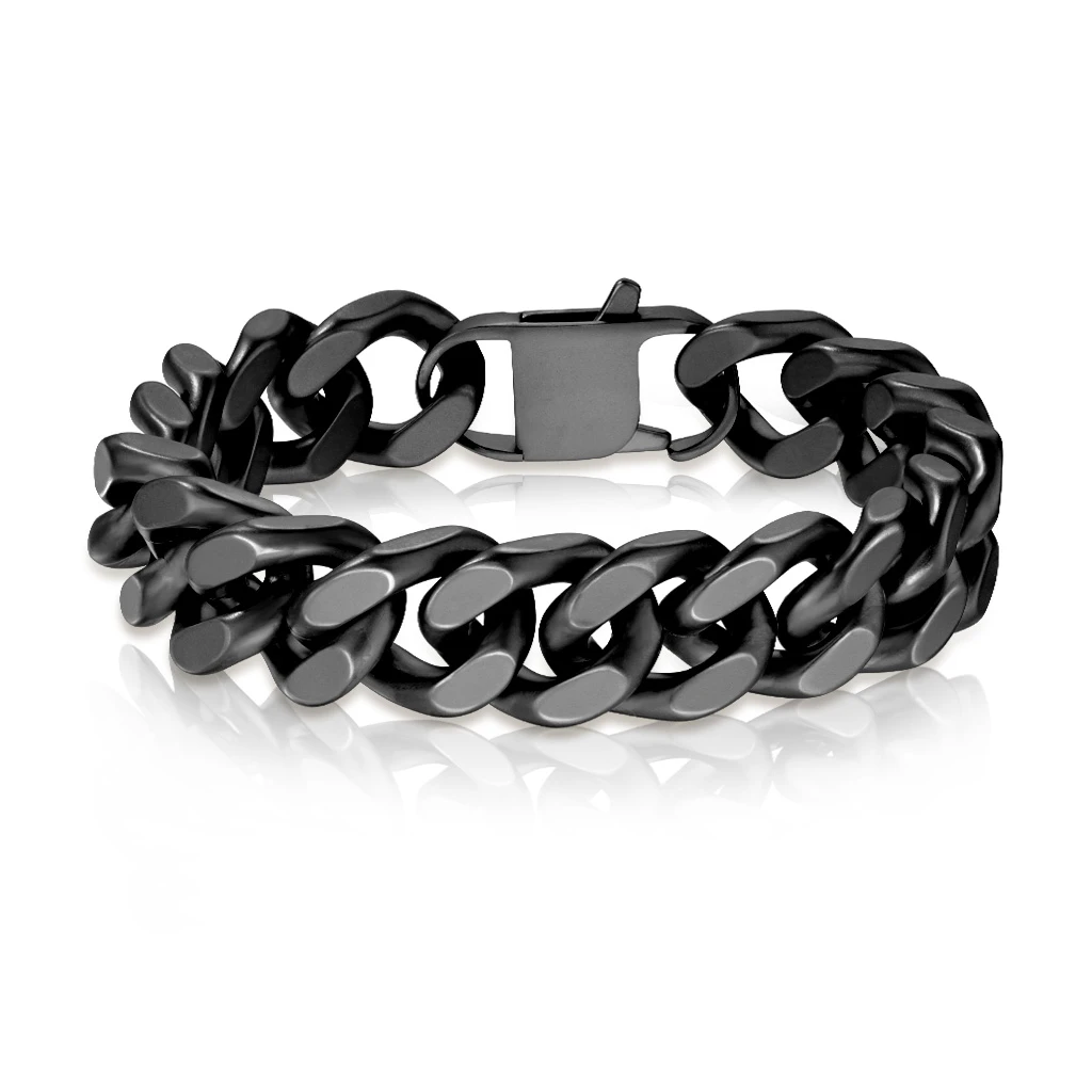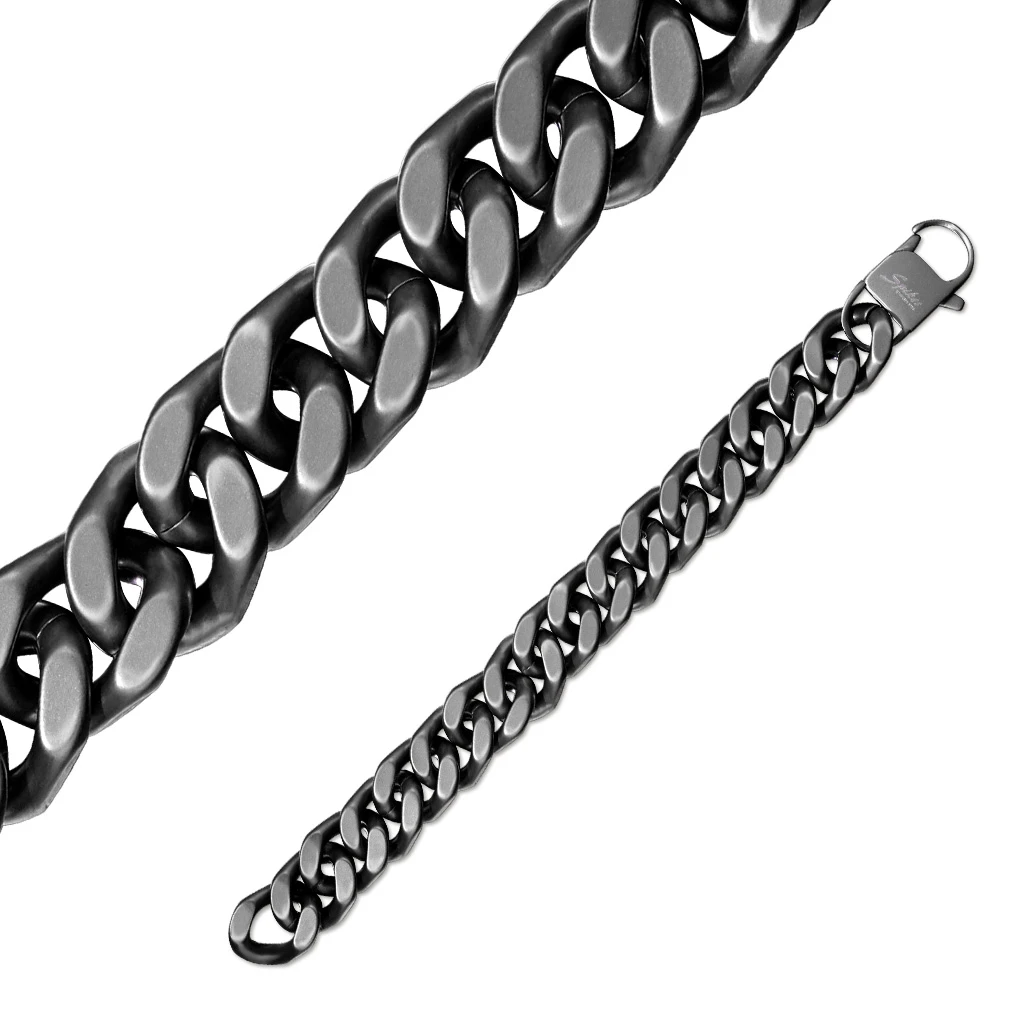Náramek na ruku pro muže z chirurgické oceli. Matný povrch náramku je upravený technologií IP na černou. Náramek je široký 16mm. Zapínání náramku je karabinové.