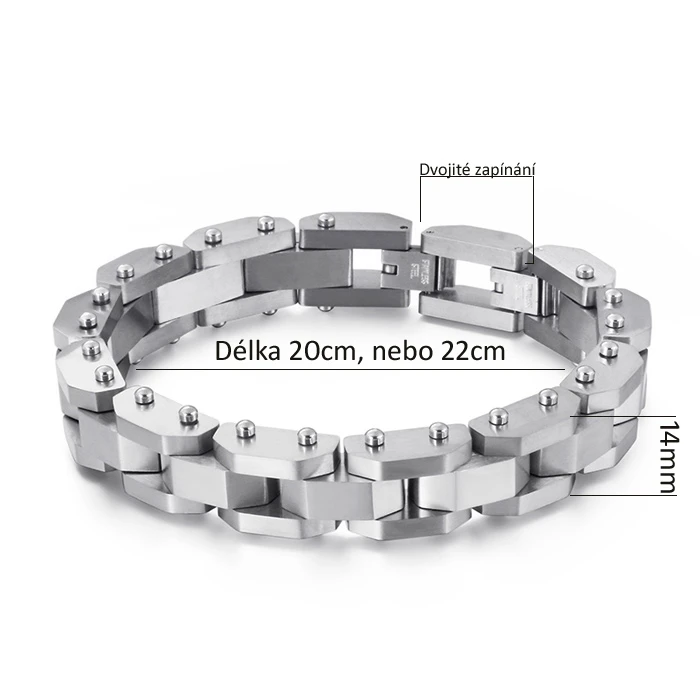 Ocelový náramek na ruku pro muže. Náramek má matný povrch. Délku náramku lze díky dvojitému zapínání zvolit na úrovni 20cm, nebo 22cm, šířka náramku 14mm.