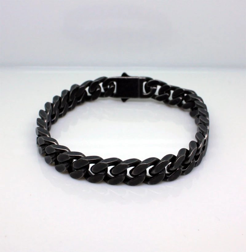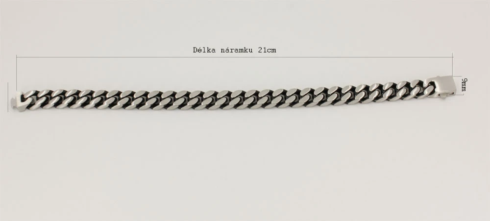 Náramek na ruku z chirurgické oceli. Povrch náramku je v barvě pistolové šedi. Délka náramku 21cm, šířka 9mm. Náramkové zapínání je na bajonet.