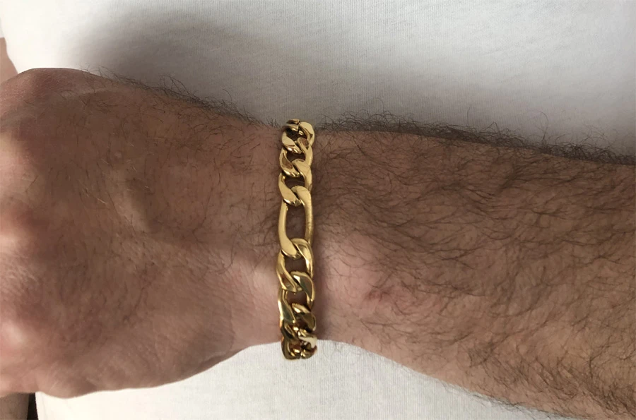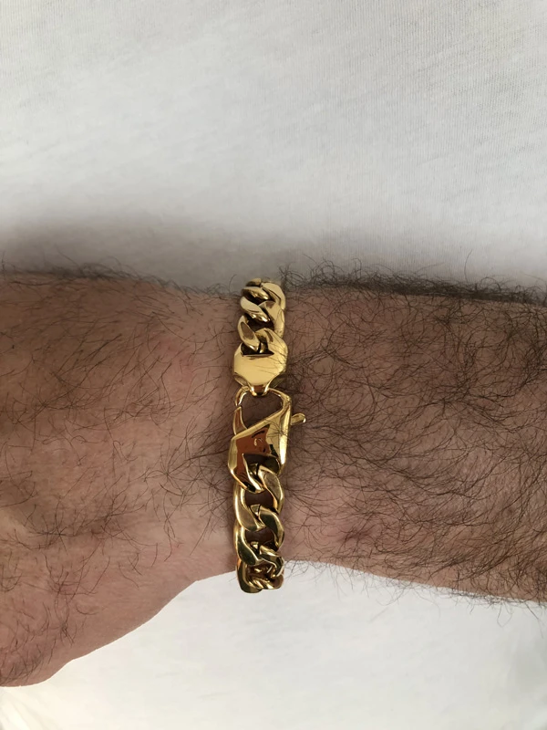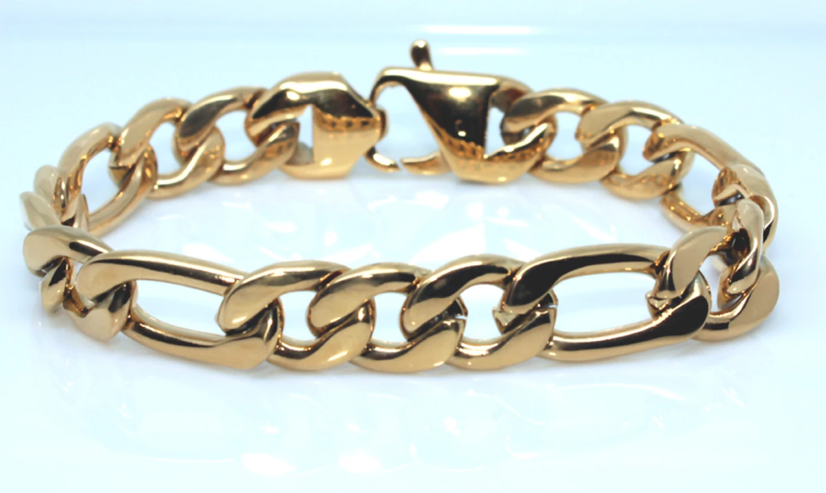 Ocelový náramek pro muže s leštěným povrchem. Povrch náramku je pozlacený technologií IP. Zapínání náramku karabinové. Délka náramku 21,5cm, šířka 11mm.