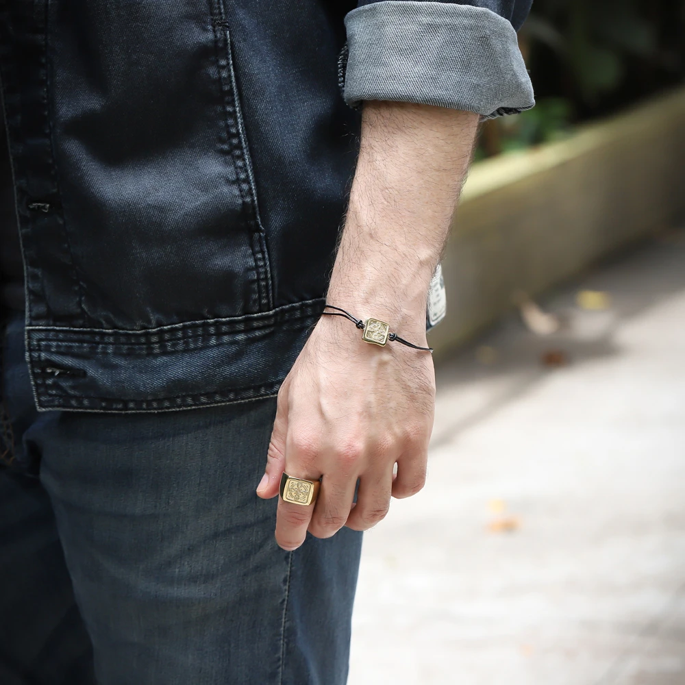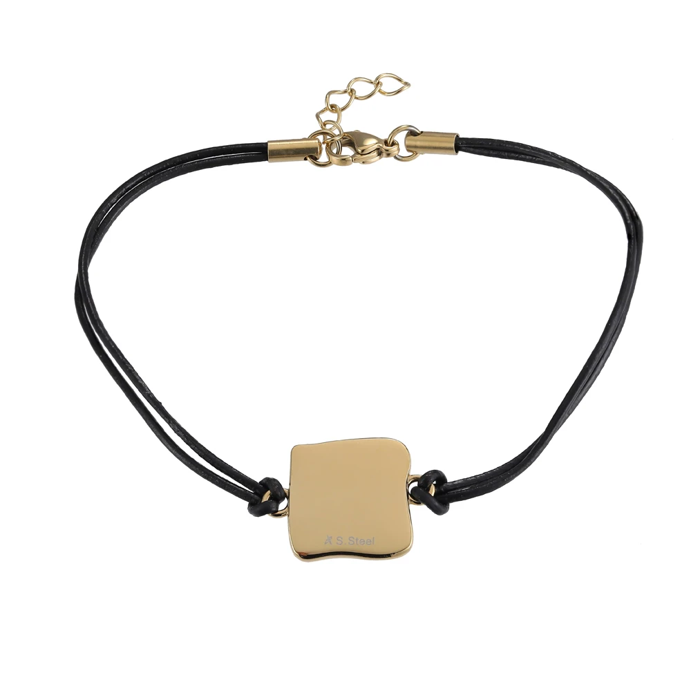 Moderní pánský náramek na ruku spojující kůži a chirurgickou ocel. Povrch ocelových částí je pozlacený technologií PVD. Ozdoba má rozměr 16x15 mm. Délku náramku lze nastavit v rozmezí 19-21 cm.