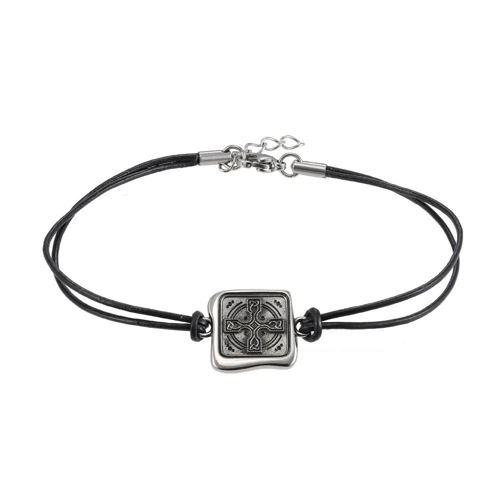 Moderní pánský náramek na ruku spojující kůži a chirurgickou ocel. Povrch ocelových částí je leštěný. Ozdoba s motivem keltského kříže má leštěné kraje, kříž je umístěný na tmavém podkladu. Ozdoba má rozměr 16x15 mm. Délku náramku lze nastavit v rozmezí 19-21 cm.