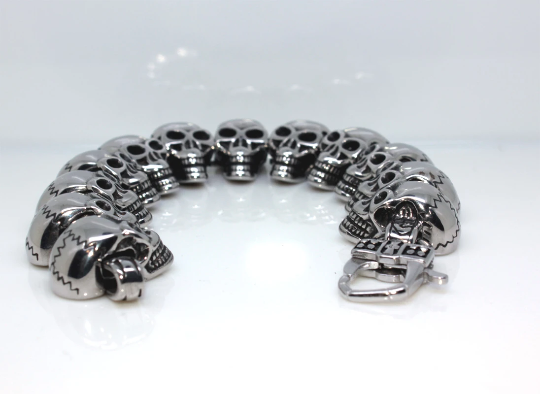 Náramek pro muže z chirurgické oceli. Články náramku o rozměru 25x14mm představují navzájem propojené lebky. Náramek má leštěný povrch s černými detaily. Délka náramku 22,5 cm. Zapínání náramku je karabinové.