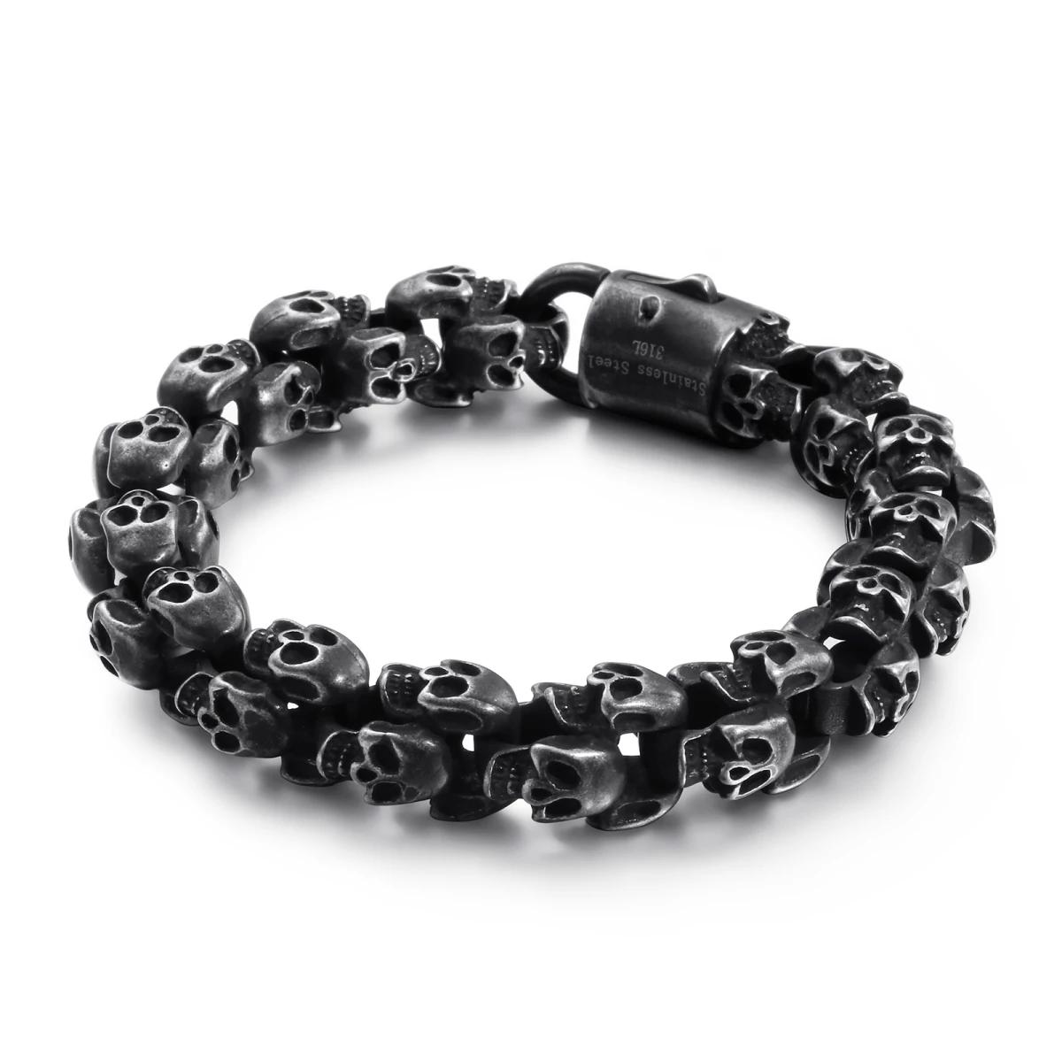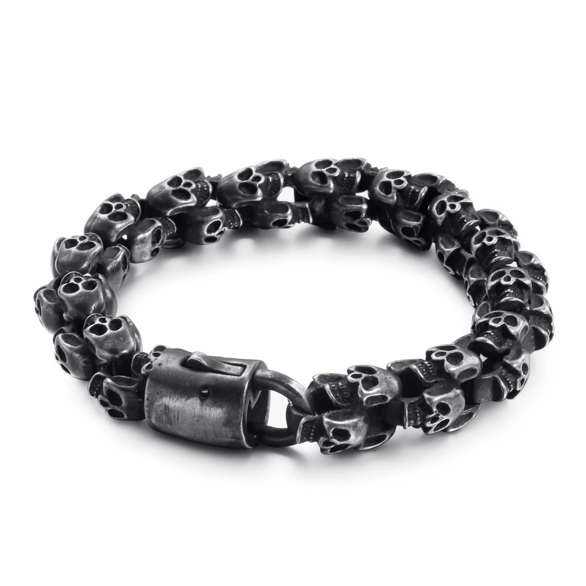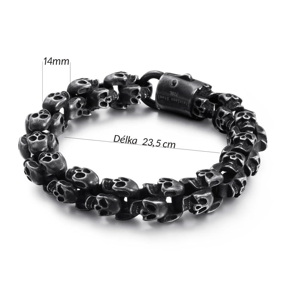 Náramek pro muže z chirurgické oceli. Články náramku o průměru 14 mm představují navzájem propojené lebky. Náramek má barvu pistolové šedi. Délka náramku 23,5 cm. Zapínání náramku je karabinové.