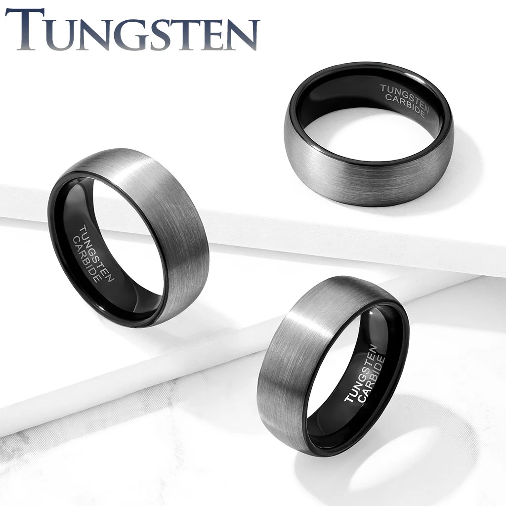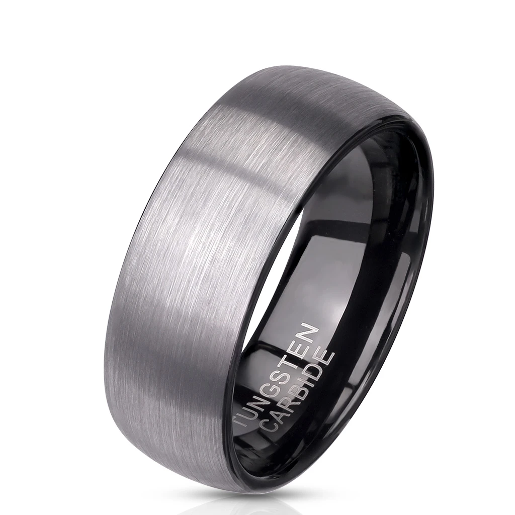 Prsten pro muže z wolframu. Vnější pohledová strana prstenu je broušená v přirozené barvě wolframu, vnitřní strana je lesklá černá PVD barva. Prsten je široký 8mm.