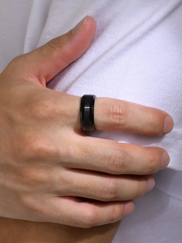 Pánský prsten z wolframu v černé pistolové barvě. Okraje prstenu a jeho vnitřní strana jsou leštěné, střed prstenu je broušený matný. Prsten je široký 8mm.