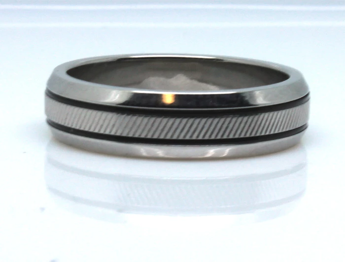 Prsten z chirurgické oceli pro muže. Prsten má leštěné okraje, středem prstenu nese jednoduchý vzor ohraničený černými linkami. Prsten je široký 6mm.