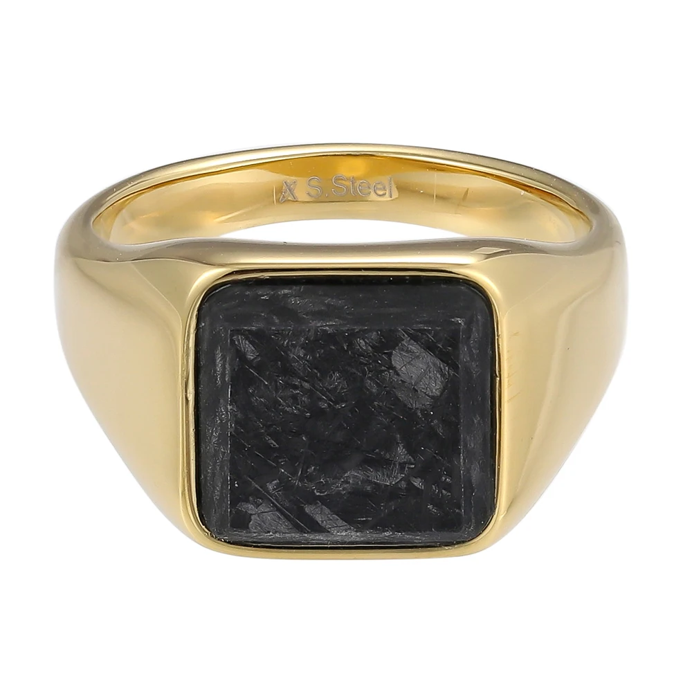 Prsten pro muže z chirurgické oceli s ozdobou z kovaného uhlíku. Kovaný uhlík je velmi odolná kompozitní slitina složená z malých uhlíkových kousků. Povrch prstenu je leštěný pozlacený technologií PVD. Rozměr ozdoby 11x11mm. Obroučka prstenu je v nejužším místě široká 3mm a postupně se rozšiřuje na 13mm.