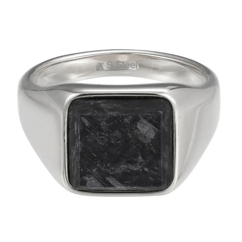 Prsten pro muže z chirurgické oceli s ozdobou z kovaného uhlíku. Kovaný uhlík je velmi odolná kompozitní slitina složená z malých uhlíkových kousků. Povrch prstenu je leštěný. Rozměr ozdoby 11x11mm. Obroučka prstenu je v nejužším místě široká 3mm a postupně se rozšiřuje na 13mm.