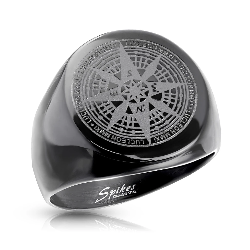 Ocelový pečetní prsten pro muže s kompasovou růžicí. Prsten má černý povrch upravený technologií IP. Obroučka prstenu je v nejužším místě široká 3 mm a postupně se rozšiřuje na 18 mm. Průměr pečeti s obrázkem růžice 18 mm.