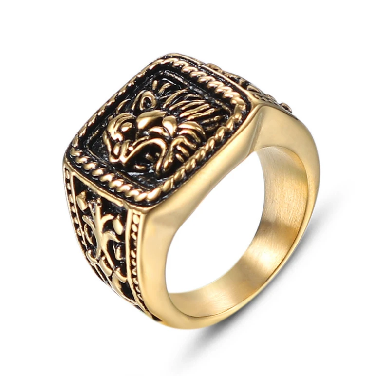 Pánský pečetní prsten z chirurgické oceli. Povrch prstenu je pozlacený technologií IP. Obroučka prstenu je v nejužším bodě široká 5,5mm a rovnoměrně se rozšiřuje na 13mm. Rozměr pečetidla s motivem lví hlavy 13x17mm.