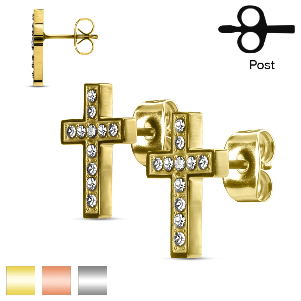 Ocelové náušnice křížky vyrobené z chirurgické oceli. Náušnice pecky osazené zirkony. Pecky se do uší zapínají pomocí puzetek. Dřík zapínání náušnic má průměr 0,8mm.