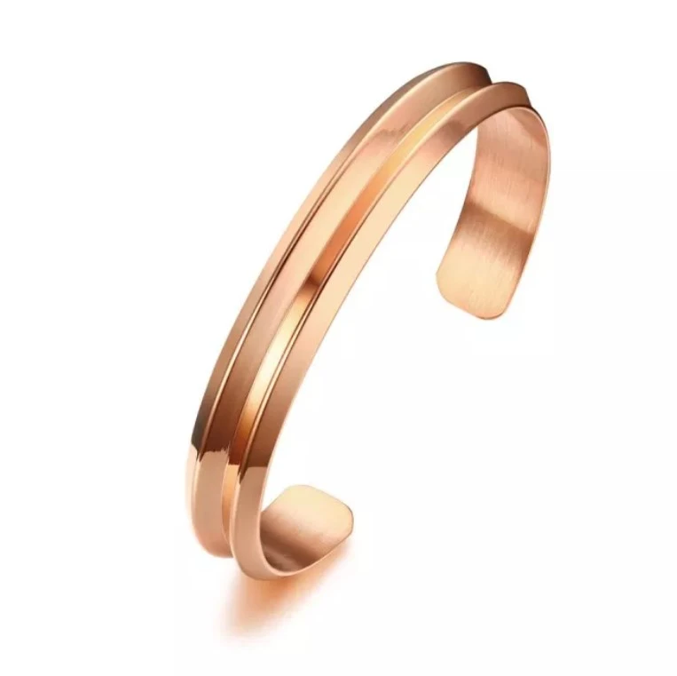 Ocelový pevný náramek na ruku z chirurgické oceli. Povrch náramku na pohledových stranách je leštěný, vnitřní strana náramku je matná. Náramek je pozlacený technologií PVD. Náramek je široký 10 mm, vnitřní průměr náramku 56 mm.