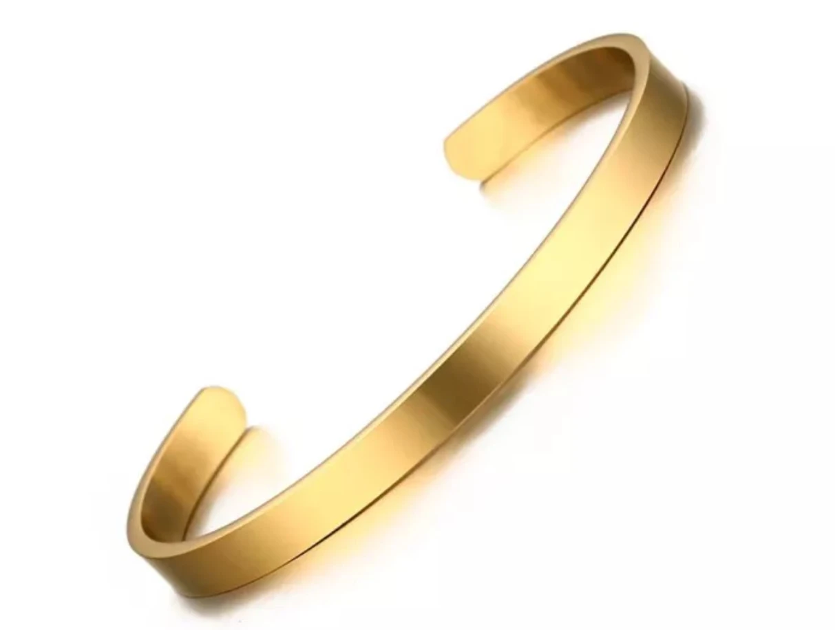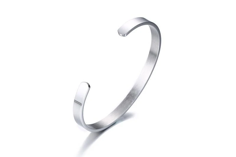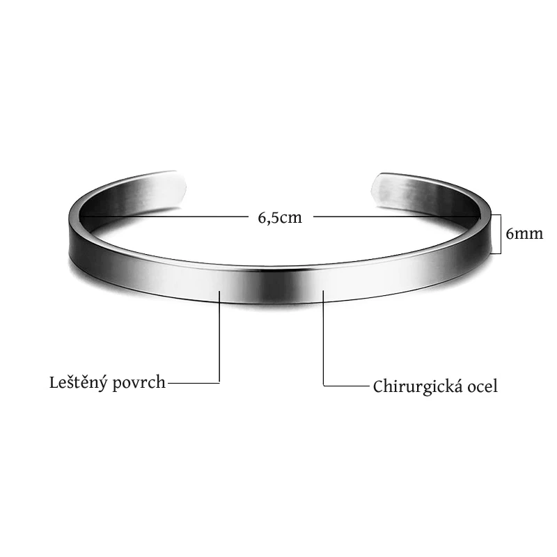 Ocelový pevný náramek na ruku z chirurgické oceli. Povrch náramku na pohledových stranách je leštěný, vnitřní strana náramku je matná. Náramek je široký 6mm, vnitřní průměr náramku 6,5cm.