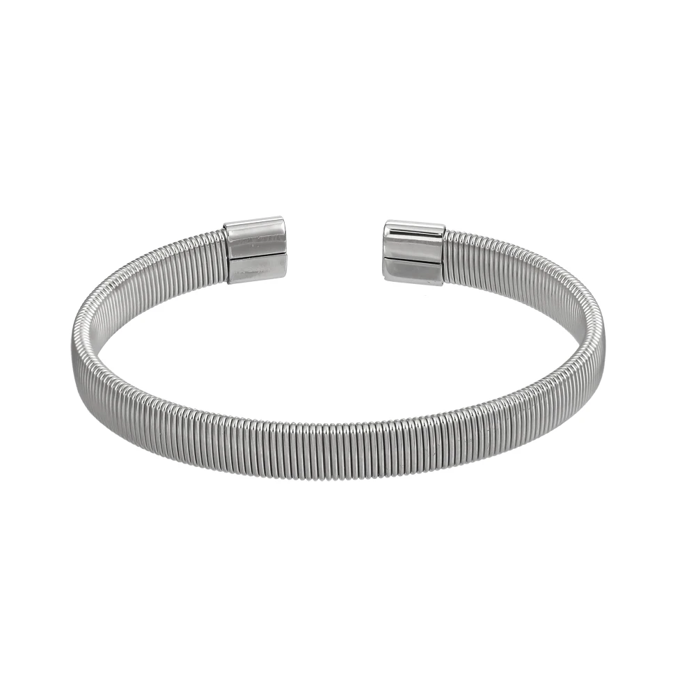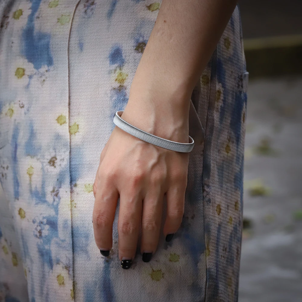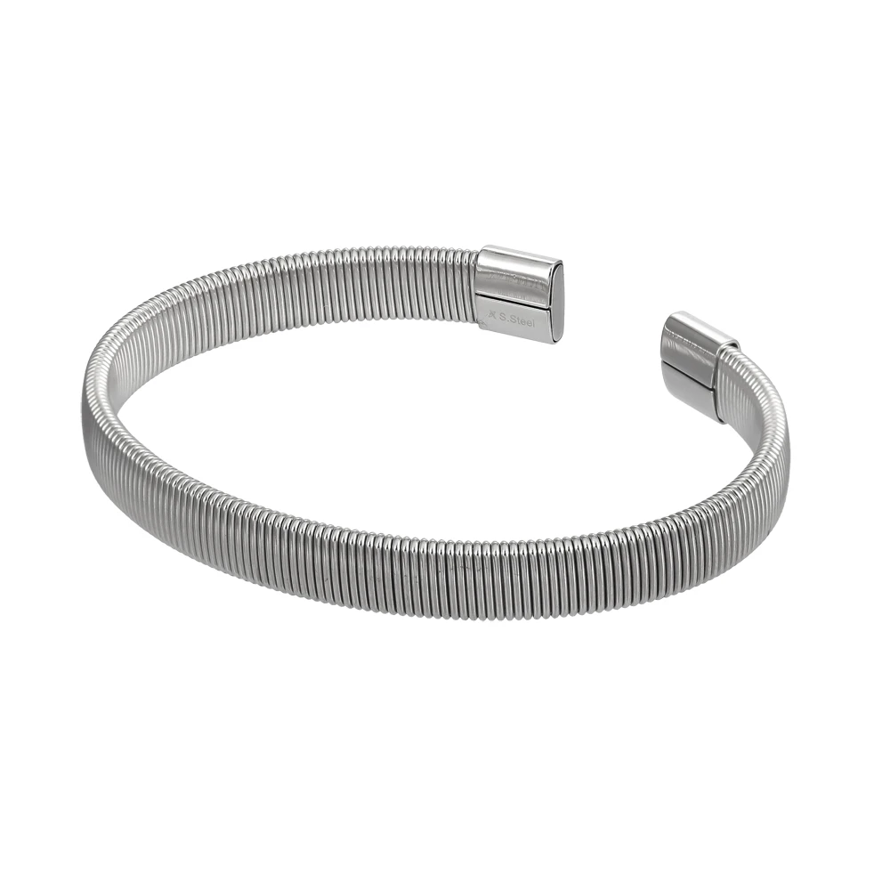 Pevný ocelový náramek na ruku. Povrch náramku je leštěný s plastickým vzorem. Oba konce náramku jsou zakončené leštěným futrem. Náramek je široký 8 mm, vnitřní rozměry náramku 60x50mm.