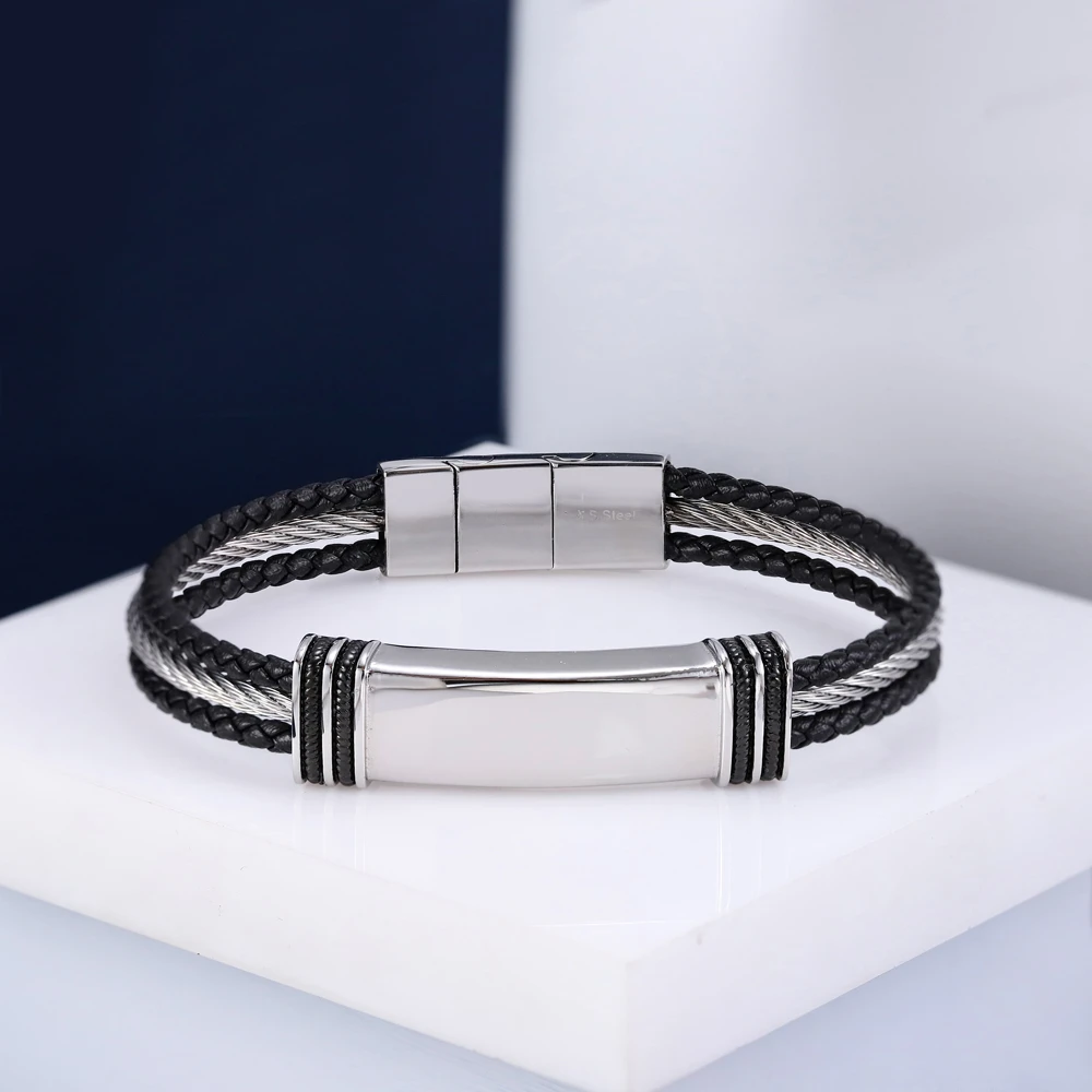 Pevný náramek na ruku z chirurgické oceli a kůže. Náramek tvoří destička s rozměrem 14x45mm, jedno ocelové lanko a dvě kožená lanka. Magnetické zapínání umožňuje měnit délku náramku na 21 cm, nebo 20 cm.
