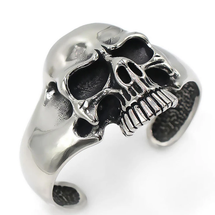 Pevný ocelový náramek s lebkou. Tak jako všechny ocelové šperky je i tento pevný náramek s lebkou odolný proti poškozený, neoxiduje, nemění barvu ani nevyvolává alergické reakce.