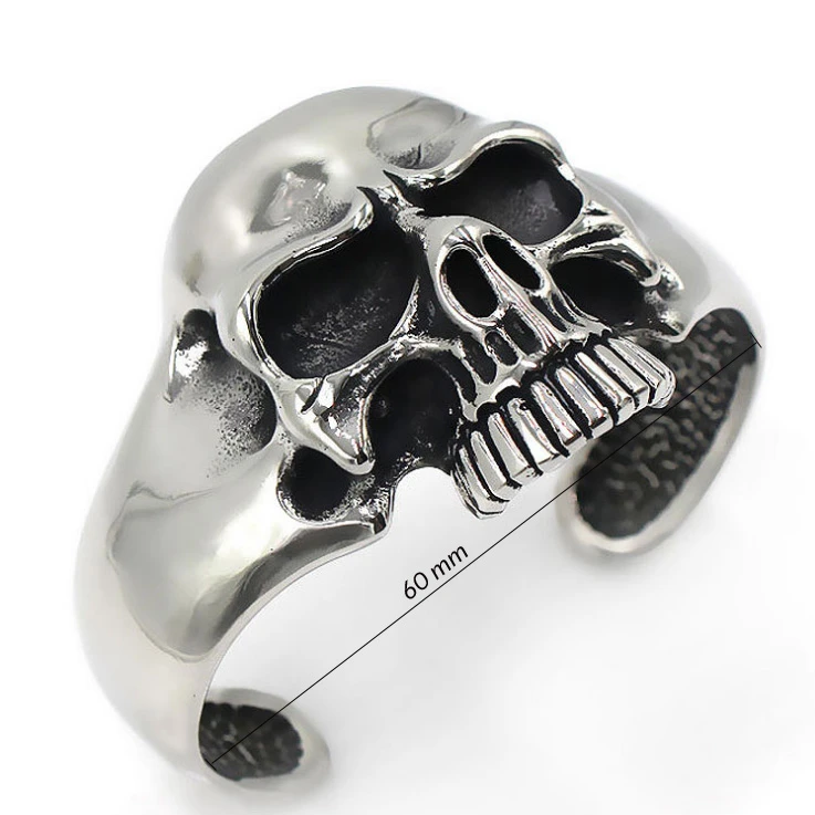 Pevný náramek s lebkou vyrobený z chirurgické oceli. Náramek má leštěný povrch s černými prvky. Rozměr lebky 42x40 mm. Vnitřní průměr náramku 60 mm.