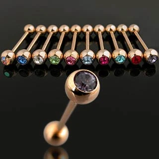 Piercing do jazyka. Piercing je z pozlacené chirurgické oceli 316L. Piercing je ozdobený zářivým kamínkem. Rozměry piercingu 1,6*16*6*5mm.