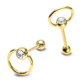 Piercing do jazyku z chirurgické oceli zlatý se zirkonem.