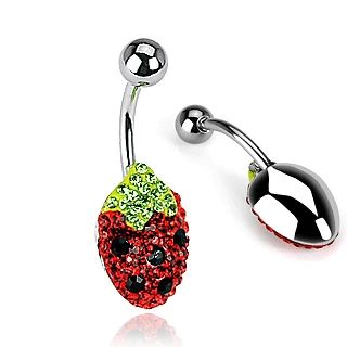 Piercing do pupíku. Dřík piercingu je z chirurgické oceli 316L. Ozdoba piercingu je porodiovaný obecný kov. Piercing připomíná "jahodu". Piercing je ozdobený zářivými kamínky. Rozměry dříku: 1,6*10*5mm, rozměry ozdoby 15*10mm.