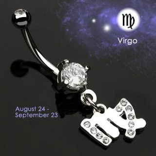 Piercing do pupíku se znamením panny. Dřík piercingu je z chirurgické oceli 316L. Ozdoba piercingu je obecný porodiovaný kov. Piercing je ozdobený zirkony. Rozměry piercingu: dřík 1,6*10mm, rozměry ozdoby 9*10mm.