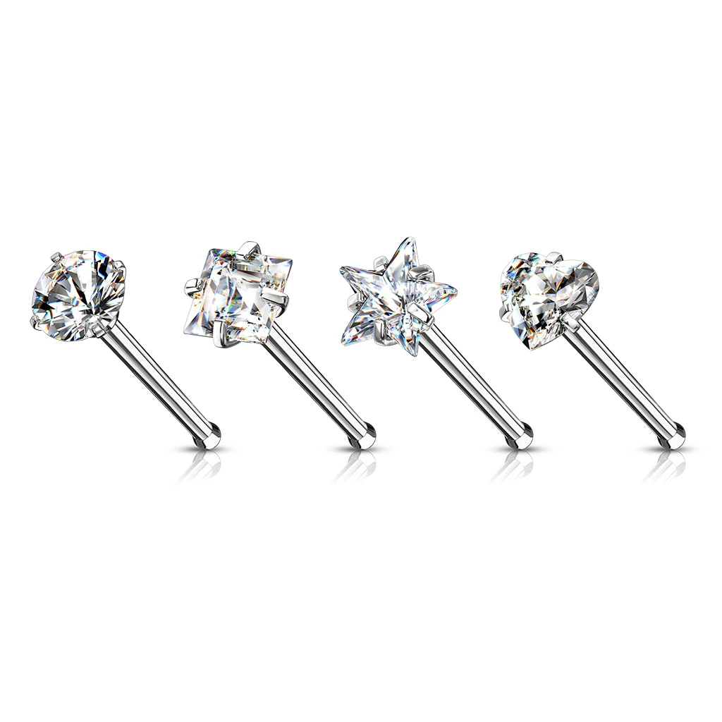 Piercing do nosu z chirurgické oceli se zirkonem v sadě 4 kusů. Dřík piercingu má průměr 0,8mm, délka dříku 7mm. Ozdoba se zirkonem má průměr cca 3,0mm.