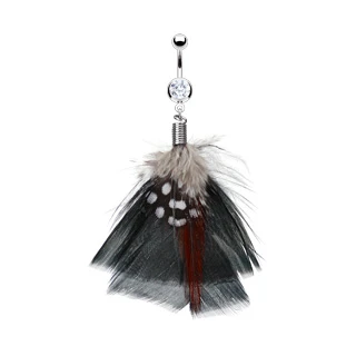Piercing pupíku. Dřík piercingu má rozměr 1,6*10mm, průměr vrchní kuličky 5mm, průměr spodní kuličky s kamínkem 8mm. Piercing je zdobený barevným peřím. Délka ozdoby cca. 60mm, šířka ozdobného peří cca50mm. Velmi netradiční piercing do pupík se kterým jistě zaujmete.